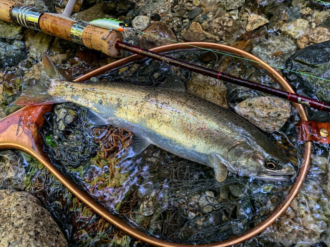 今日は午後から支流の最上流エリア。最後の民家を越え林道沿いを釣りあがる。全然釣れない。水深のある落ち込みでやっと1匹。源流なのになぜか銀毛のアマゴ。下流から上ってきたみたい。