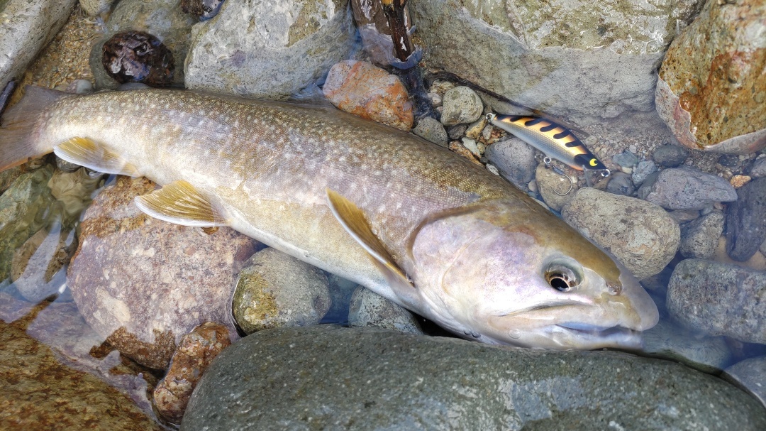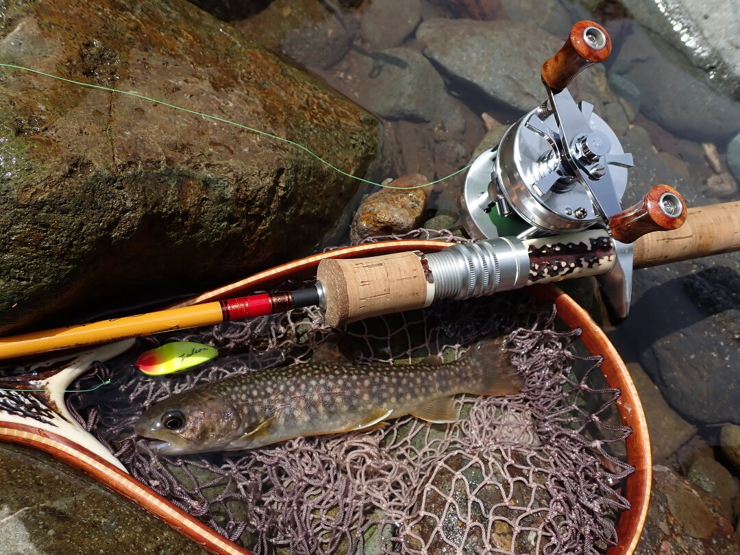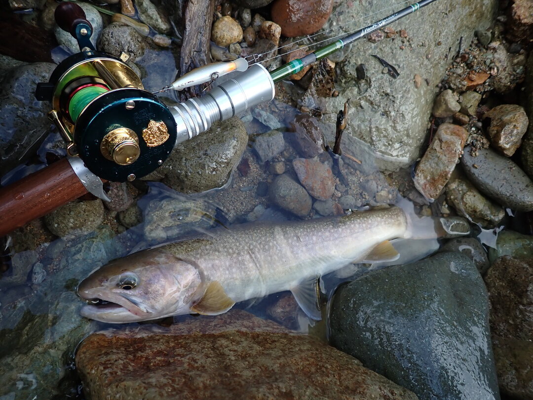 8月のオロロの大発生や仕事・家族などから、ようやく一月半ぶりに渓流に立てました。増水後のピンスポットに届きたてのベゼルアダプタとセルタブラウンを持ち、しかしネットを忘れていました。この35cmを獲る前に泣き尺をバラシ、この魚は獲ろうと確保できそうなポイントをみながら誘導し、何とか撮影できました。別日に今度はタックルを2つ持って行き、初のデビーで魚を獲ました。バイトするために浮いてくるところなど丸見えでトップはやっぱり楽しいです。