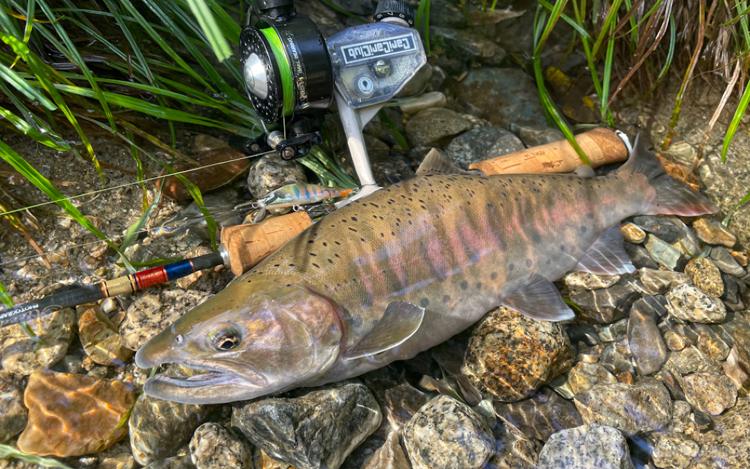 遡上系はほぼ見つけることができませんでしたが、まさかここで今年はもう諦めていた体高のある尺山女魚に出会える事ができました。