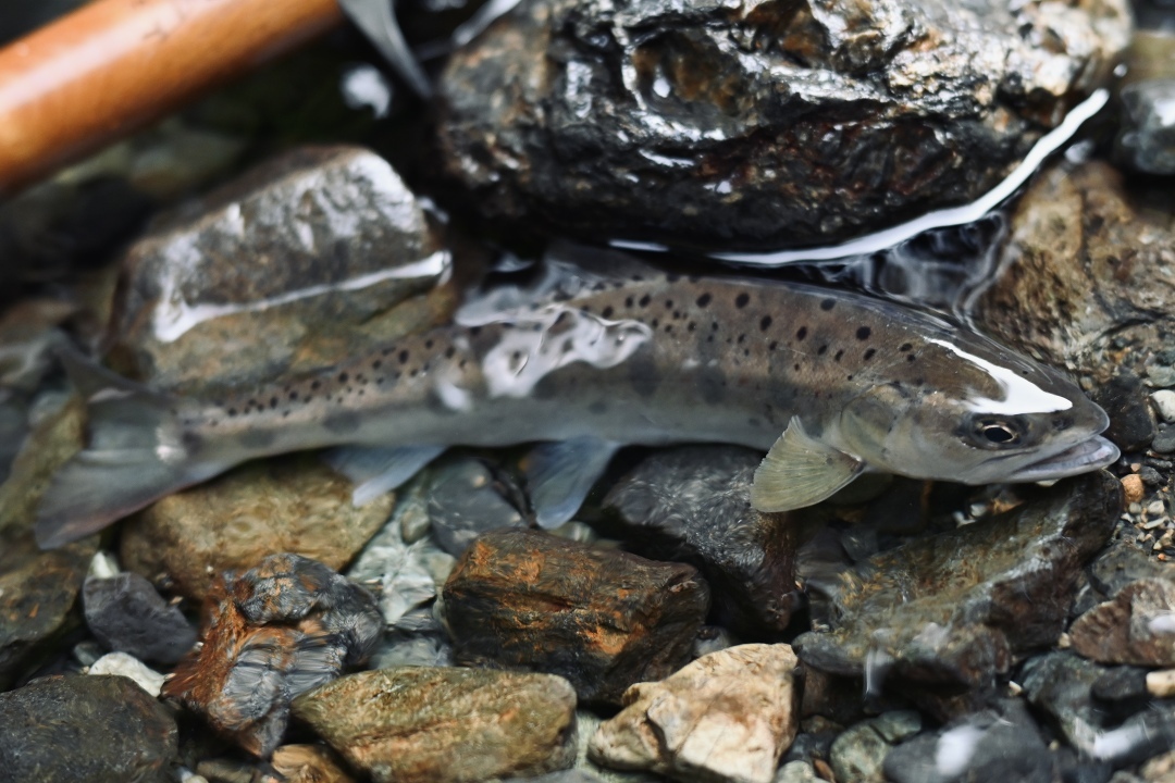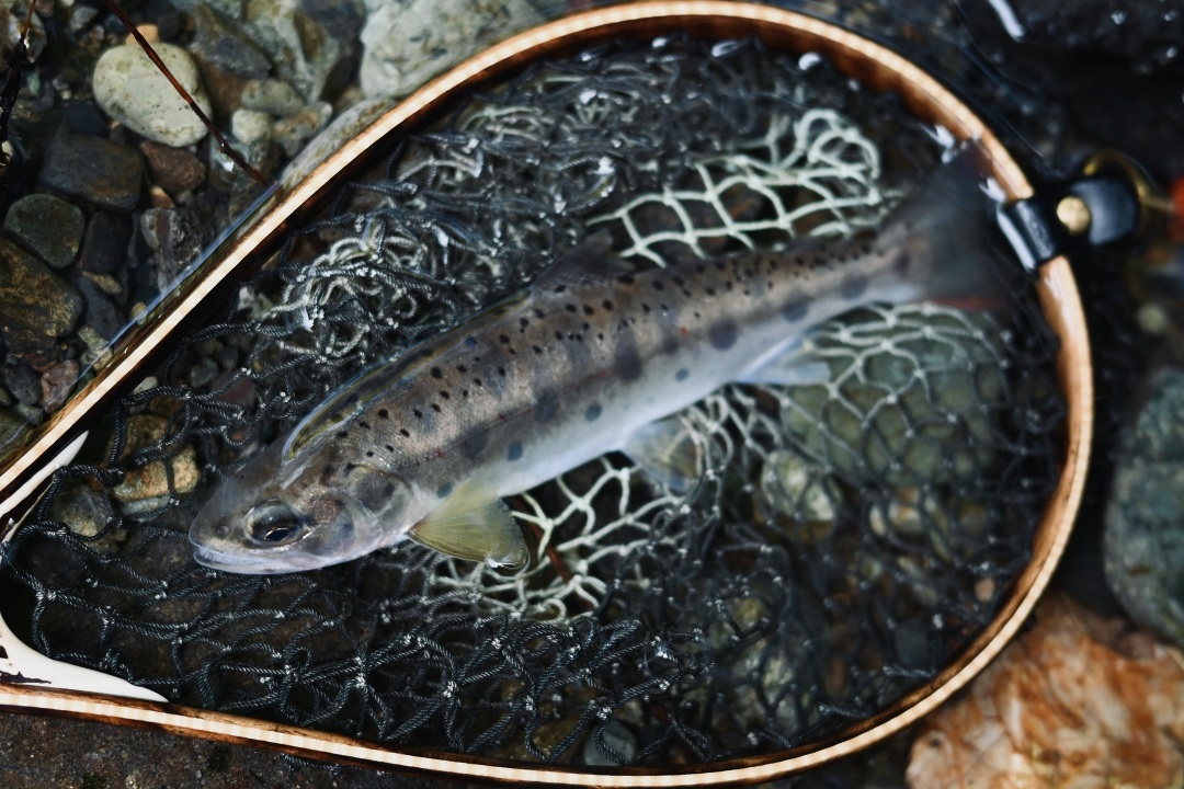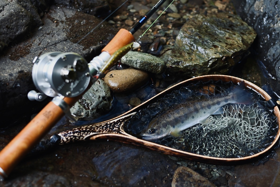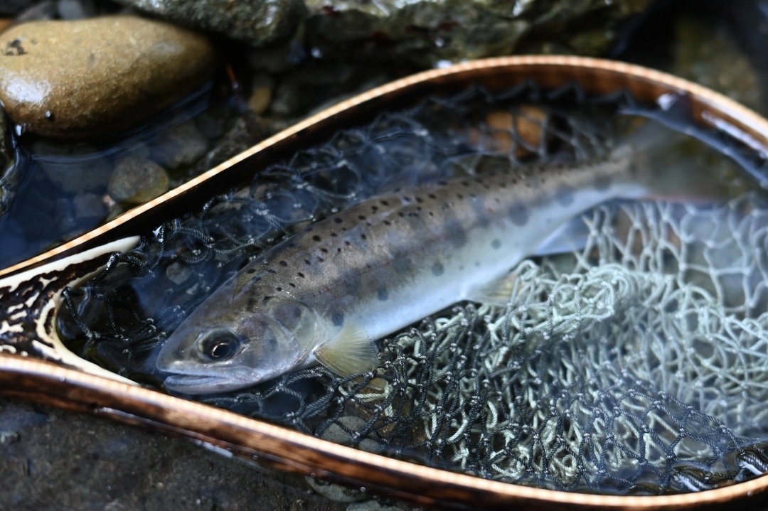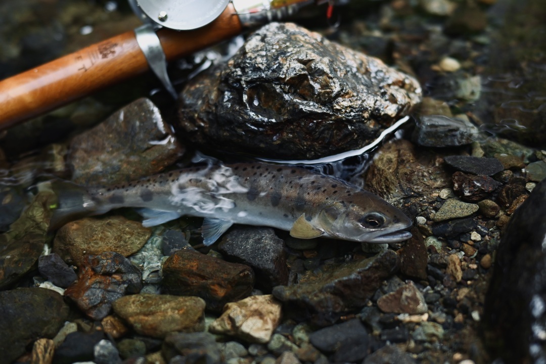 まだ6時半だというのにすでに灼熱のような暑さ。汗だくで虻に怯えながら釣り上がっていると、ちょっとした落ち込みと橋の陰が重なった、いかにも涼しげなポイントが。一投目は手前をチェック、つづいて奥の反転流から泡下を引いてくる。気持ち良くルアーをひったくったのはなかなかの良型山女魚だった。