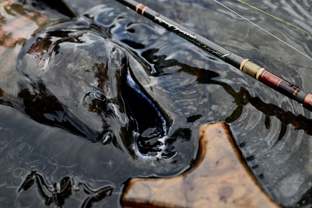 ブラインドで掛けた魚をしっかり受け止めて