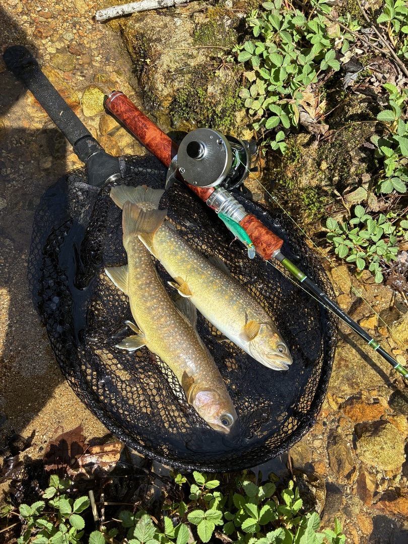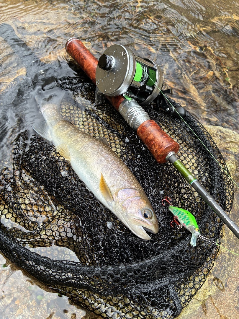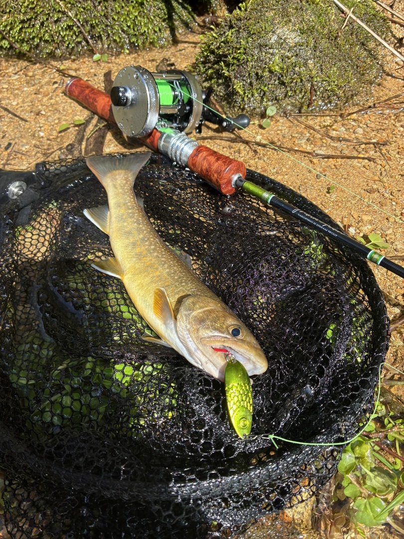 ワクワクに胸躍らす中まさかのルアーボックスを忘れてしまいJGスプーンと趣味で自作したミノーの縛りとなりました…悲