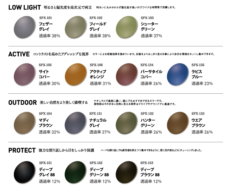 *それぞれの商品ページの購入ボタン(選択欄)は最も明るいシリーズ3種類の両面マルチコートになっています。(それ以外のレンズをご希望の際は備考欄に明記ください。)